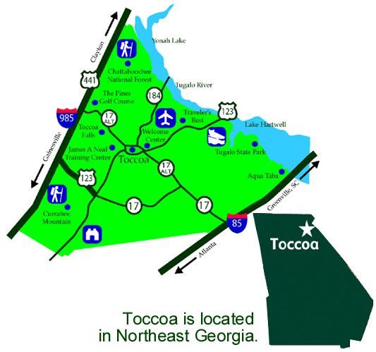 The City of Toccoa and Stephens County are located in the scenic foothills of the Appalachian Mountains in northeast Georgia. Toccoa and Stephens County offer visitors a diverse range of activities and attractions-from historic sites to tour to mountain and lake activities to shopping and dining. So, hop in your aircraft and fly on in. We'll be looking forward to your visit.